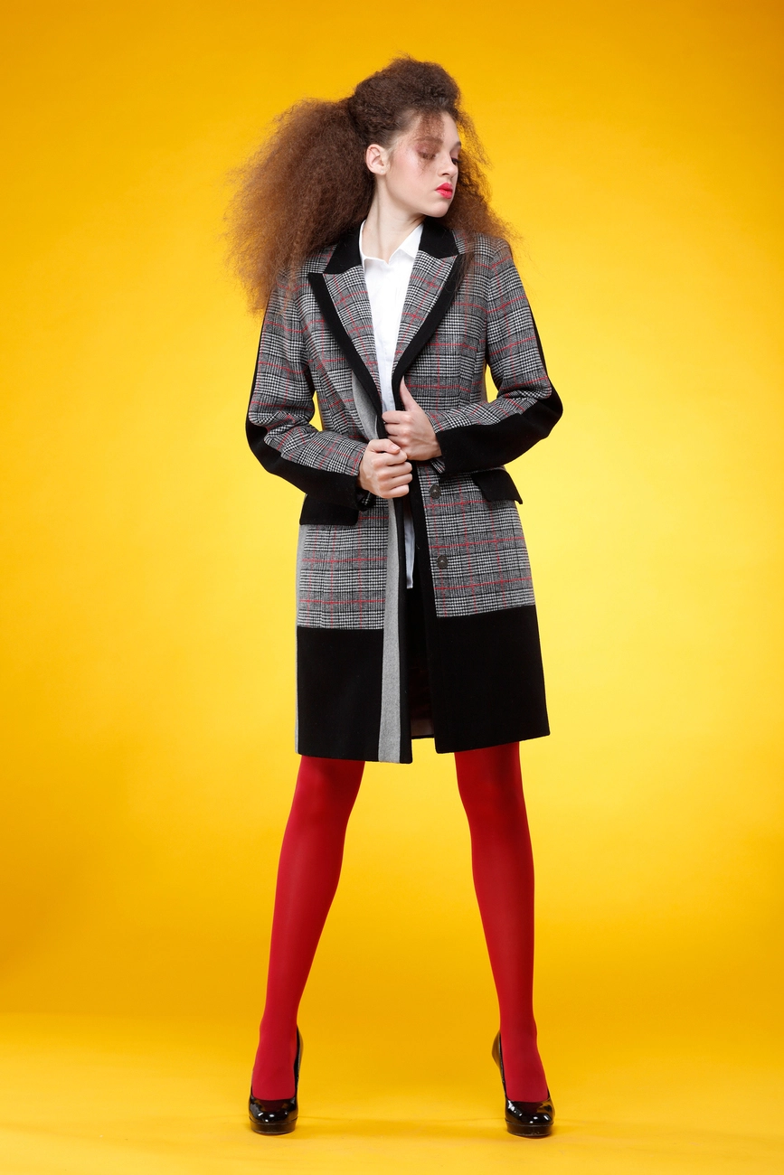 Смелое сочетание трёхцветных и разнофактурных тканей, контрастная отделка в виде лампасов,