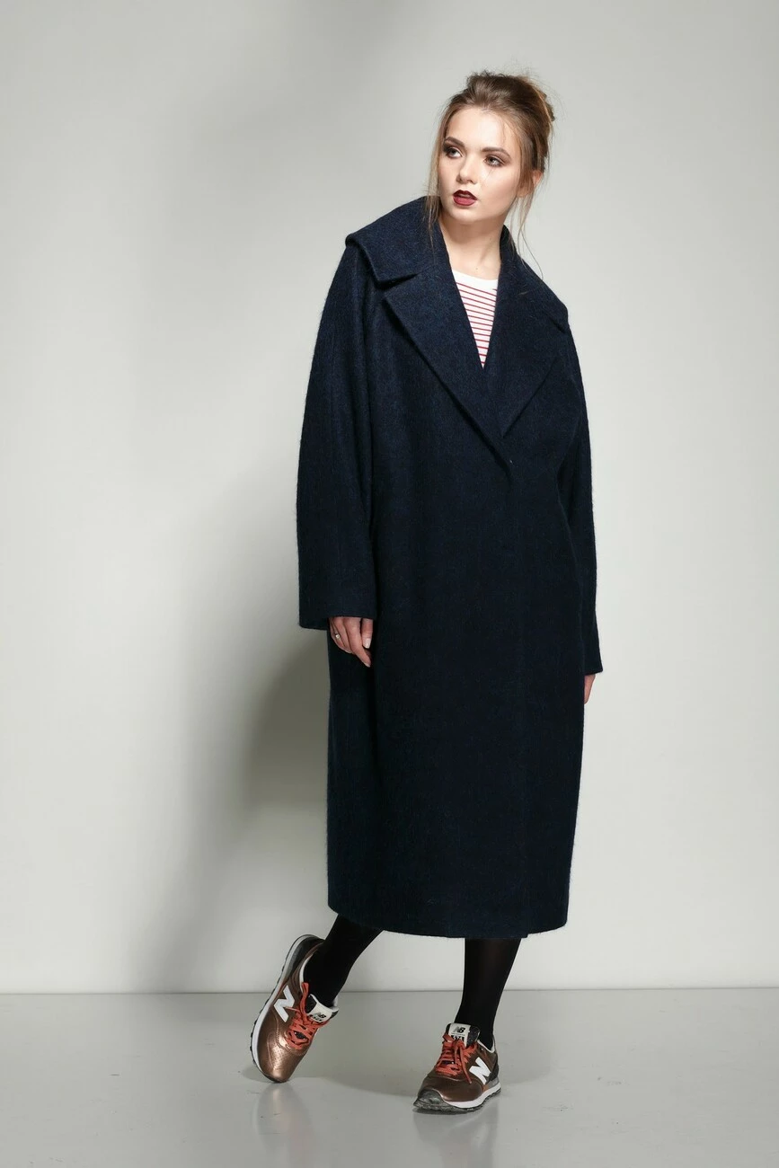 линией плеча; широкие лацканы и воротник имитирующий полукапюшон;